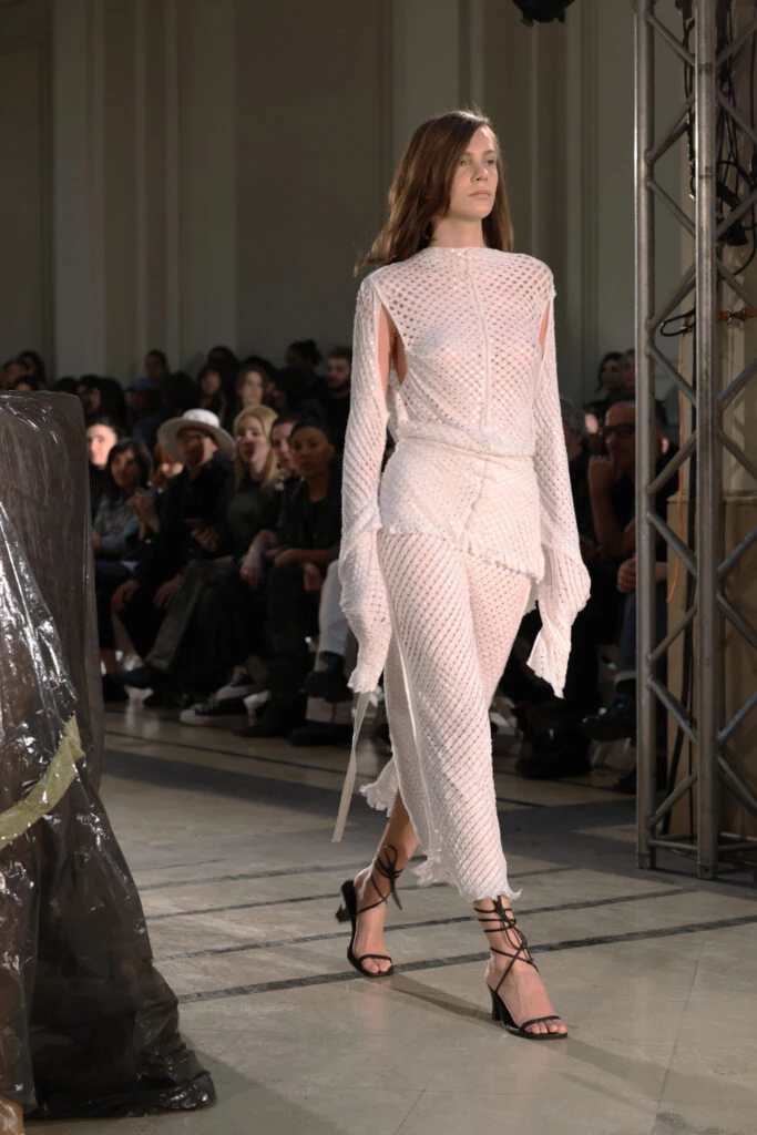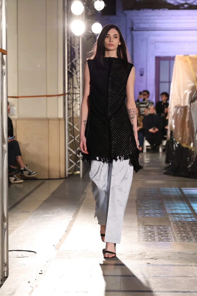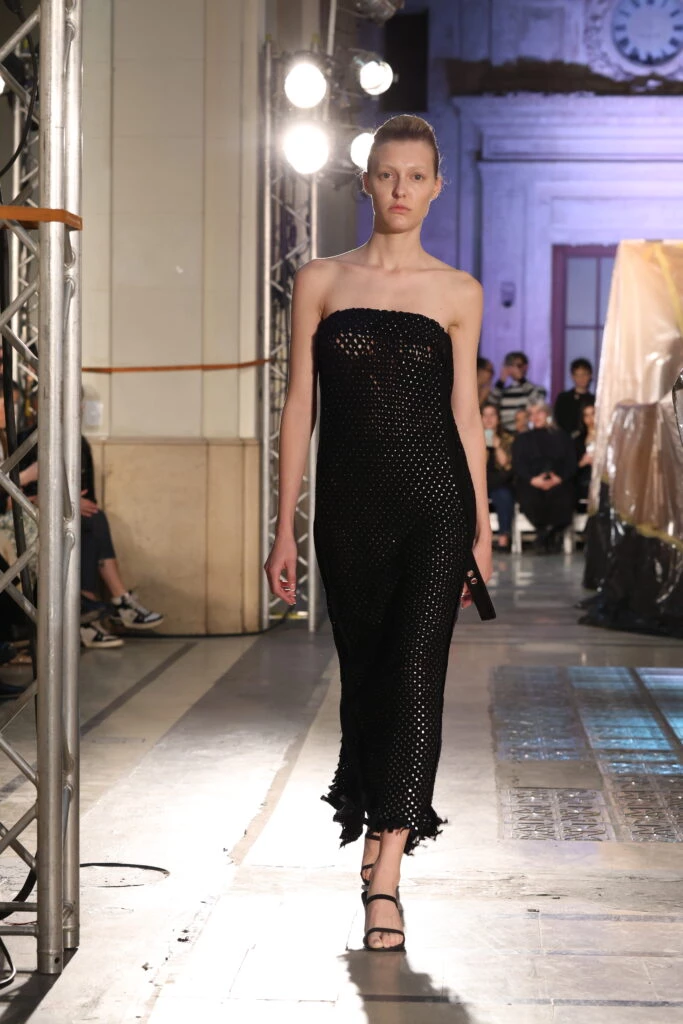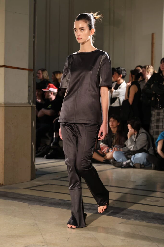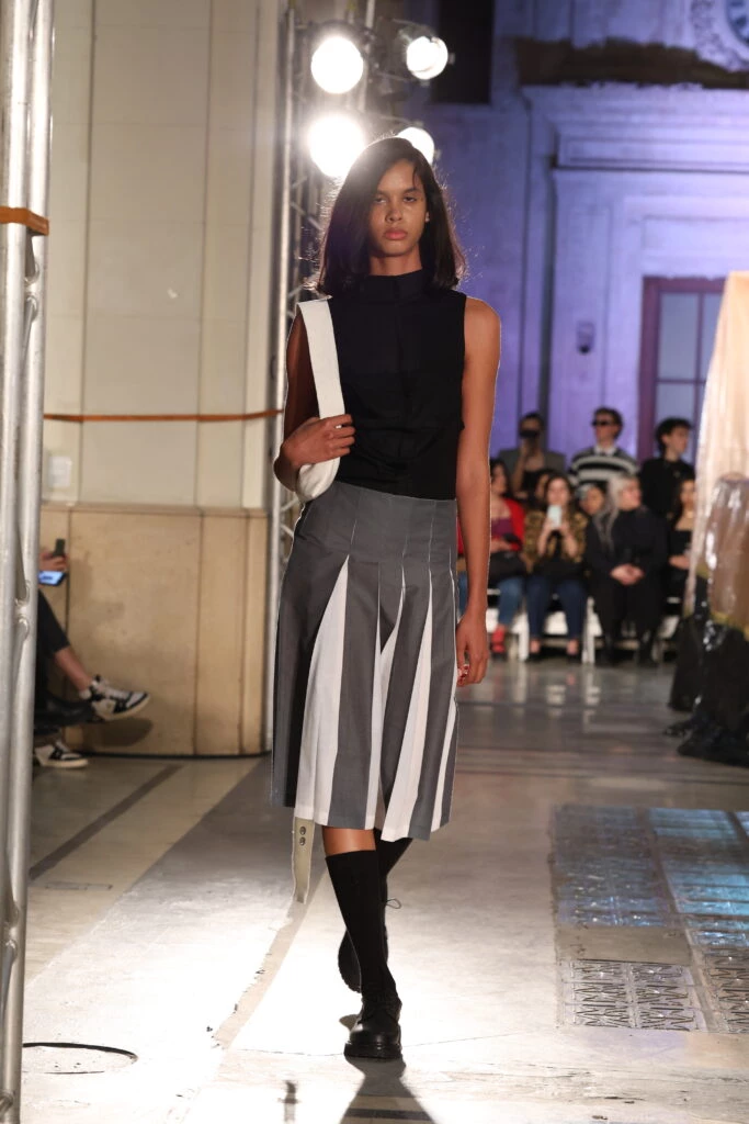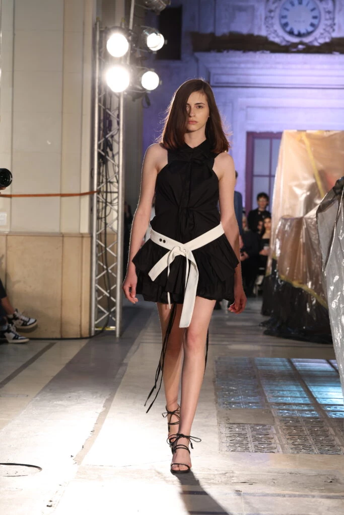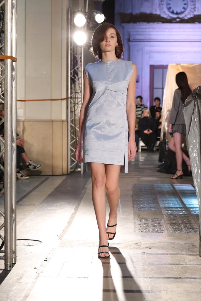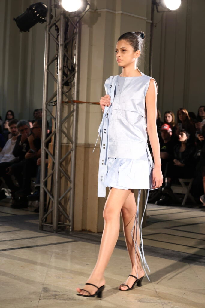 Tablas, frunces, mangas abultadas, cinturas ceñidas, vestidos de hilo, satén gris y colores como el negro, el gris brillante, el azul, el rojo, el marrón y el cyan, fueron las tendencias que dominaron la colección presentada en pasarela.