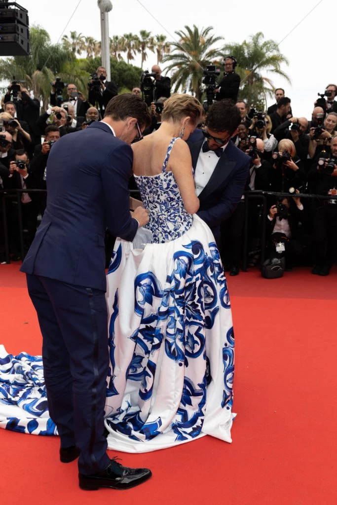 La actriz llegó luciendo una impresionante creación de Dolce & Gabbana en blanco y azul, con una estampa de estilo Maiolica de la firma. Se trata de un diseño transformable de dos piezas, compuesto por vestido entallado con breteles y escote corazón, sobre el que se disponía una voluminosa doble falda con larga cola.