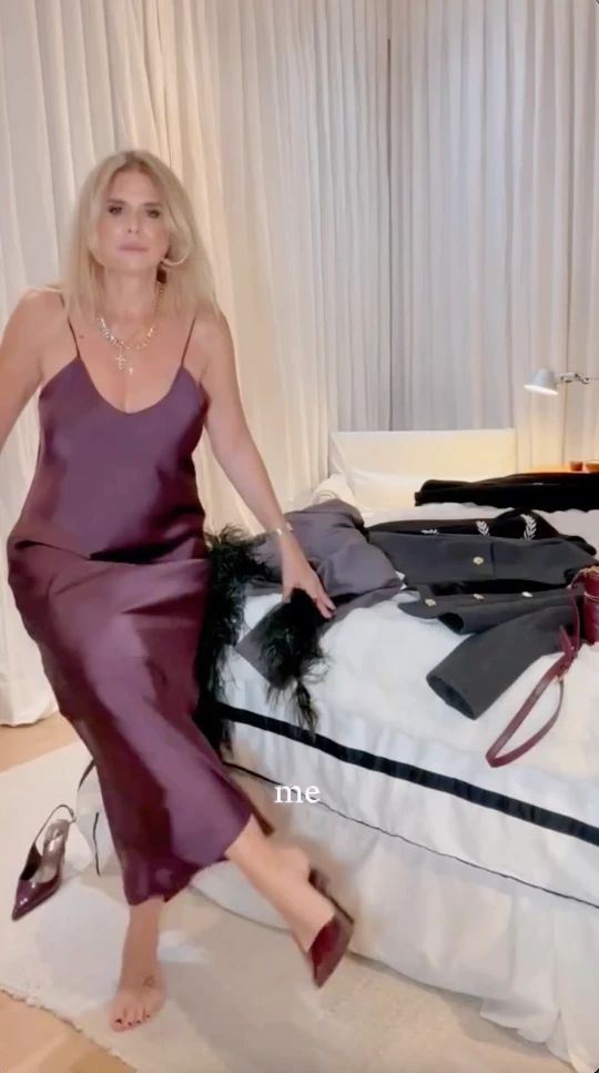 La tercera versión es la más pura: el vestido lencero sin capas. Con stilettos en el mismo tono, deja que la silueta y el brillo hablen por sí solos. Es la prueba de que menos puede ser mucho más.