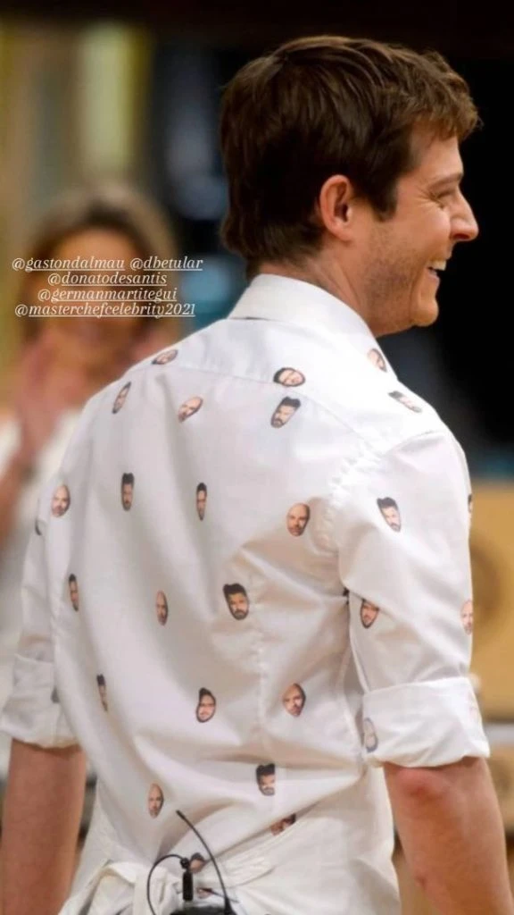 Pero en la última gala fue más allá y en lugar de flores, arabescos o rayas, en esta oportunidad llevó un diseño con las caras de Donato de Santis, Germán Martitegui y Damián Betular estampadas.