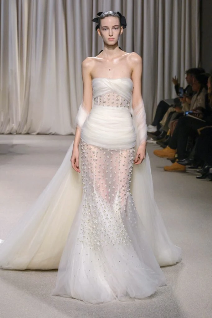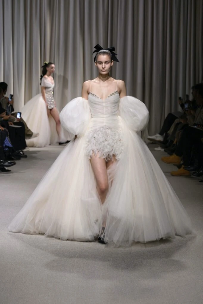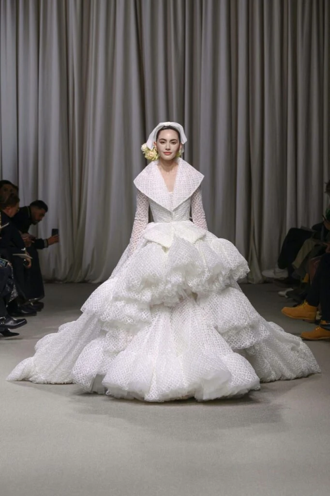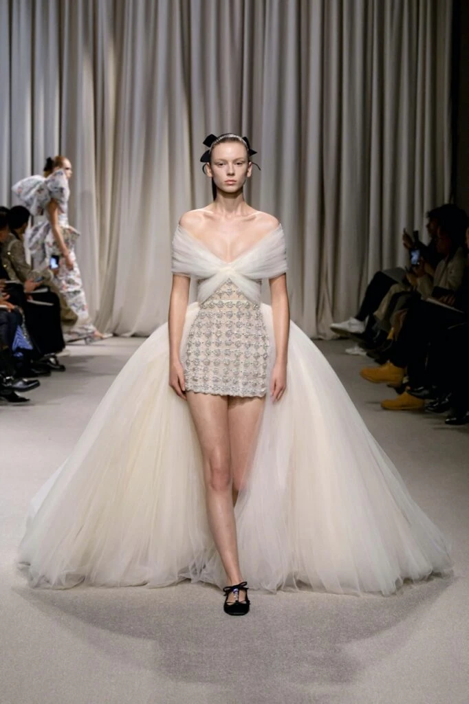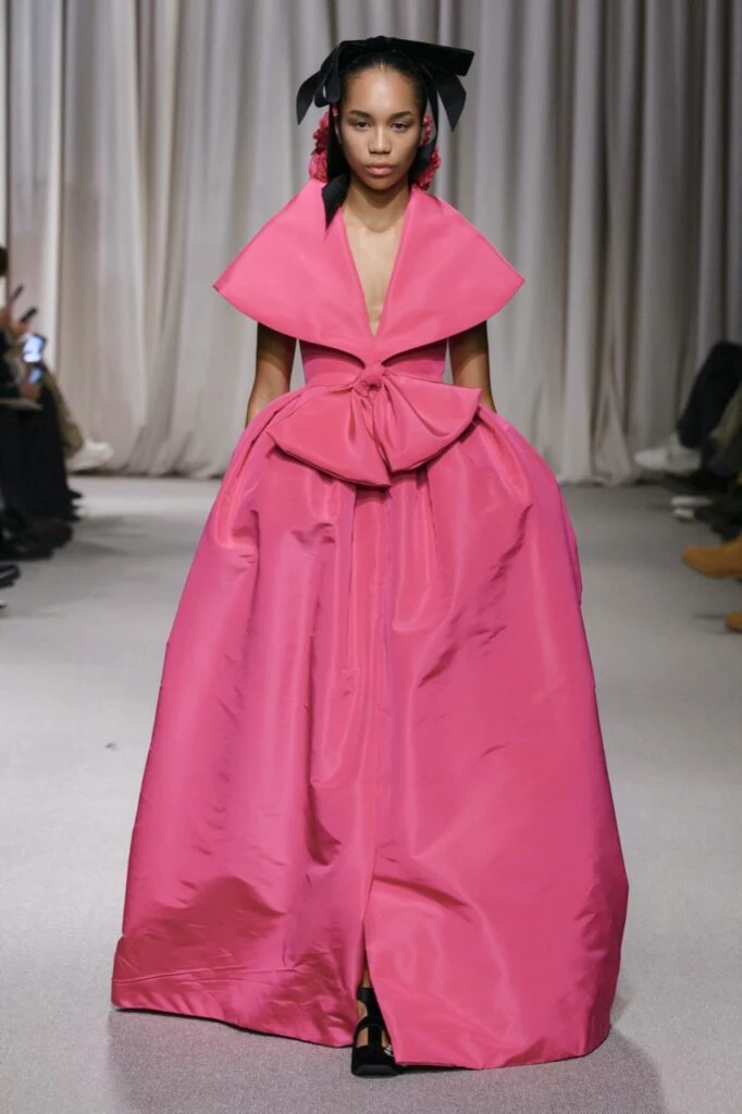 La colección no solo destaca por sus cortes y telas, sino también por la incorporación de detalles arquitectónicos: mangas voluminosas, pliegues estratégicos y estructuras innovadoras añaden una dimensión adicional a cada prenda, mostrando la habilidad artesanal y la visión vanguardista de Giambattista Valli.