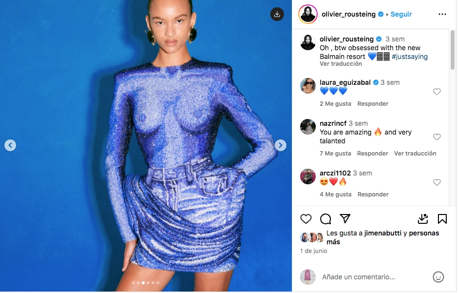La top lució un vestido Balmain Resort 2025 creado por su amigo el diseñador Olivier Rousteing. En concreto llevó una pieza íntegramente bordada con lentejuelas en azul eléctrico, que presenta la anatomía femenina grabada con lentejuelas iridiscentes.