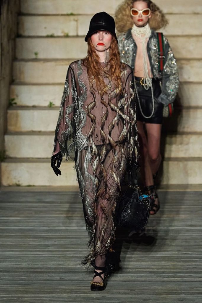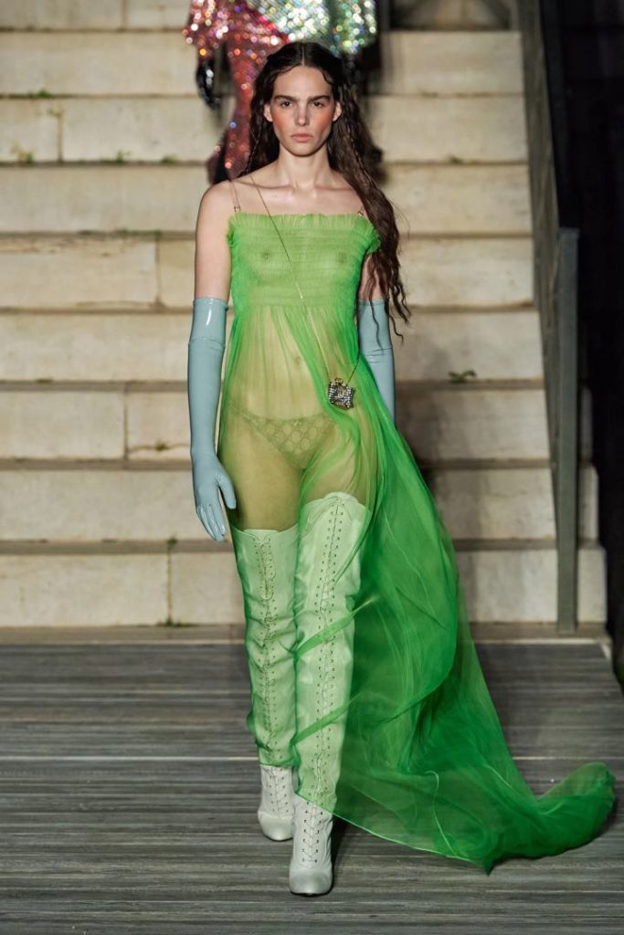 Guantes, boinas y gorros los combina con vestidos transparentes, y estampas geométricas. Las botas... Por encima de la rodilla. Las tiaras y diademas son los accesorios que remiten a la Edad Media.