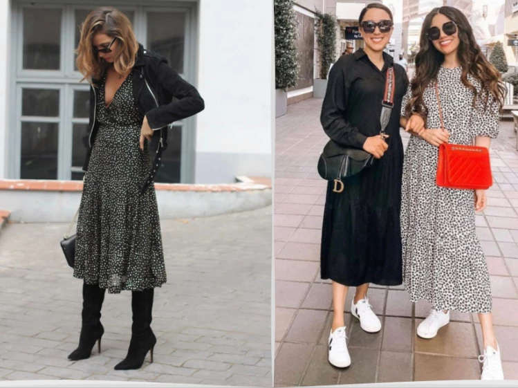 Para una versión más elegante el vestido preferiblemente debe ser negro, puede ser estampado como en la foto, y se combina con botas de gamuza negra caña alto y campera negra. Un estilo muy chic con el que seguramente vamos a destacar.