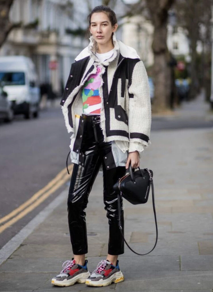 Pantalón de cuero brilloso, remera estampada, campera de corderito y cuero, zapatillas y cartera geométrica. Un look súper trendy con el que claramente no vamos a pasar desapercibidos. Además, si observamos la remera tiene los mismos colores que las zapatillas, todo muy detallista.