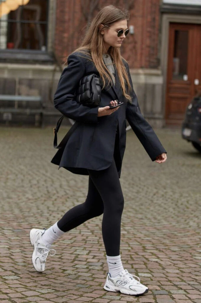 Los años 80 vuelven a ser furor y para empezar a implementarlo, nada mejor que leggings con medias y zapatillas. Un estilo que podemos combinar con blazer, como vemos en la foto para un outfit más formal, pero también con un hoodie oversize para algo más informal.