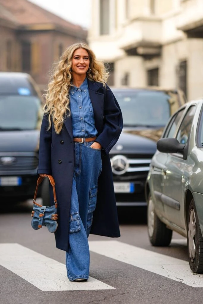 Un look con mucho denim y el azul como color principal: camisa de jean, jeans y cartera del mismo género. Con un trench por encima, el complemento ideal para salir vestida con mucho estilo.