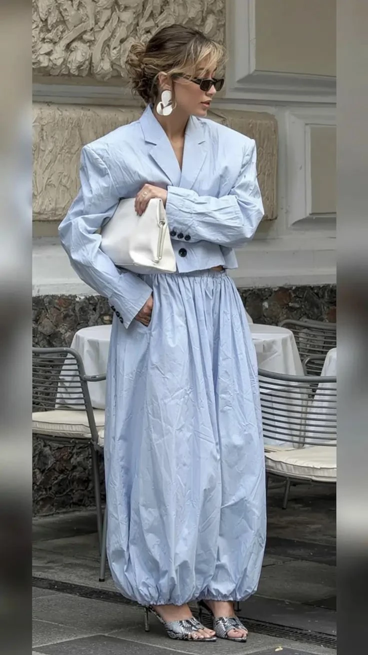 - Noche/trabajo: elevá el estilo con sandalias de taco bajo y un top ajustado o un bustier para equilibrar el volumen. Agregá un cinto fino.