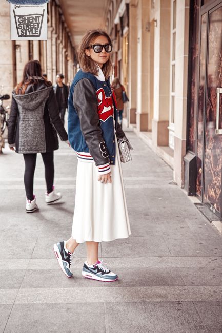 Podés lucir una campera bomber con apliques y muchos colores optando por una prenda inferior más neutra, como una falda color blanco y zapatillas para cerrar el look.