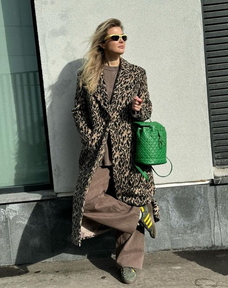 Cómo hacer que tus zapatillas clásicas de colores vibrantes sean protagonistas en este look: armando un outfit a tono con su color de base. El verde oliva se acopla al visón del conjunto y de la base del tapado de animal print. Las tiras amarillas, con el armazón de las gafas. Complementás con un bolso verde benetton y tendrás un look perfecto.