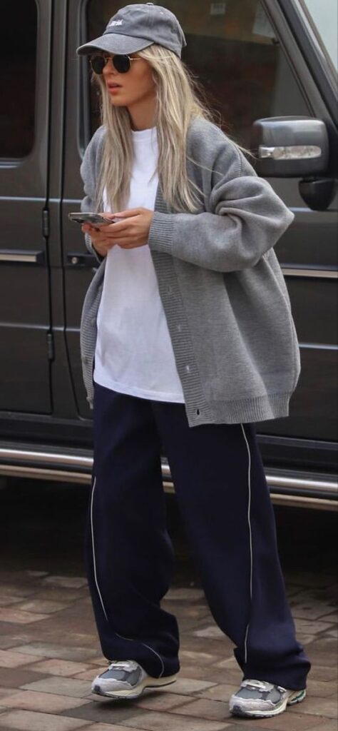 Blanco, gris y azul marino, una combinación de colores que siempre queda bien. En clave oversize, se combinaron una remera, un jogger y un cárdigan que dieron lugar a este look deportivo con mucho estilo.
