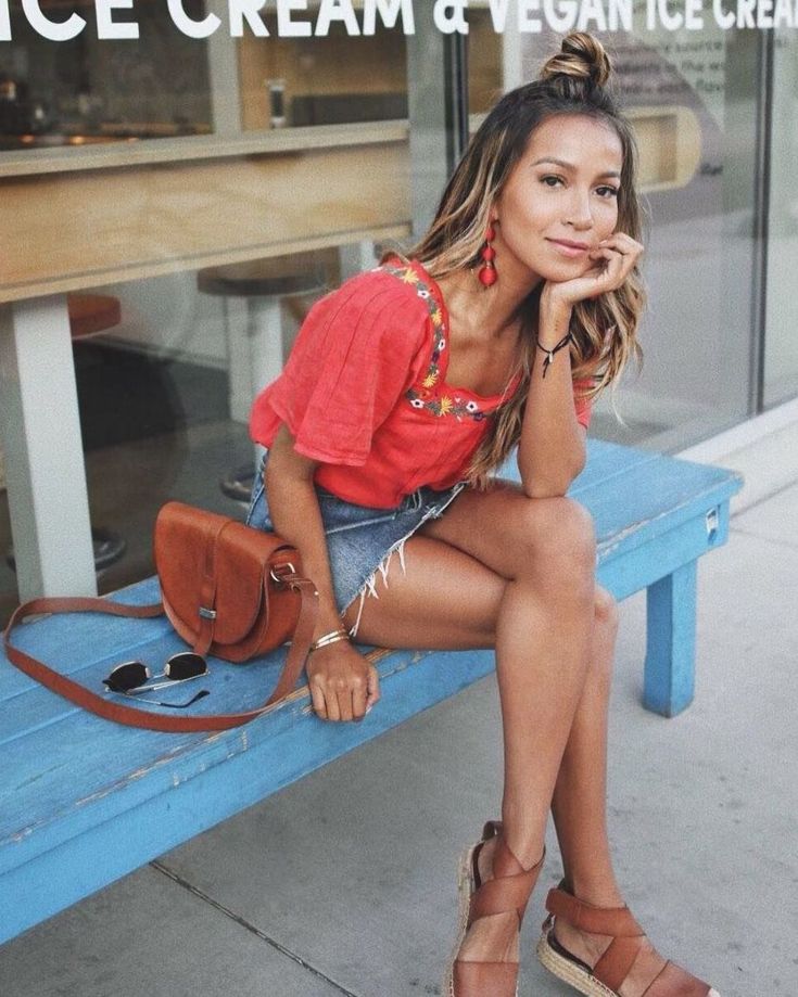 En noches de verano el aire bohemio se hace sentir: esta vez, con el color de la Navidad en una blusa rústica, bordada. Le sumás un short denim y accesorios color suela. No te olvides de unos buenos y llamativos aros al tono, con un peinado que los deje a la vista.