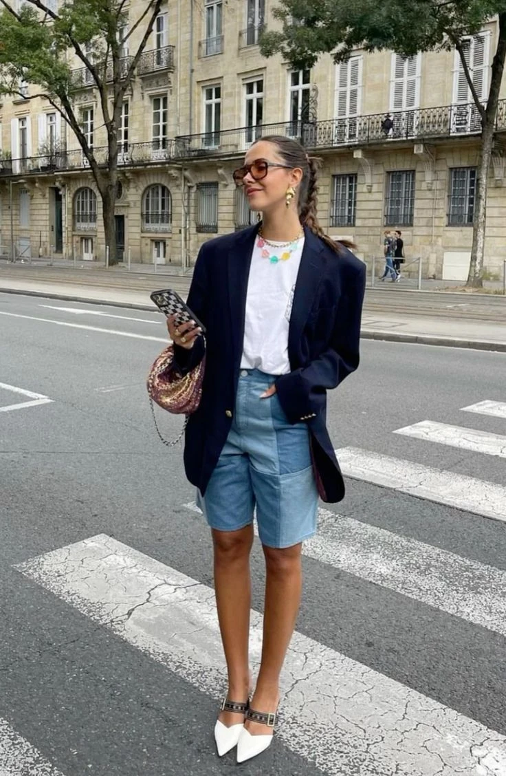 Sumar un elegante blazer azul marino a un combo informal, como una remera básica con bermudas denim puede resultar en un oufit estiloso que podés usar para ir a trabajar. Lo tenés que elevar con los accesorios ideales y un peinado trendy, que lo potencie.