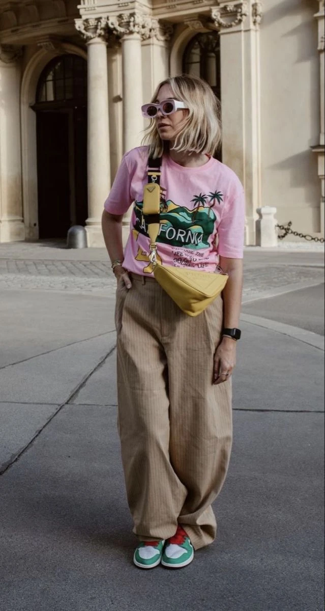 Si querés un look cómo do y canchero, adoptó un pantalón ancho, una remera estampada y unas zapatillas con cordones a contra tono. Si te animás, sumale una cartera de un cuarto color y serás toda una fashionista.