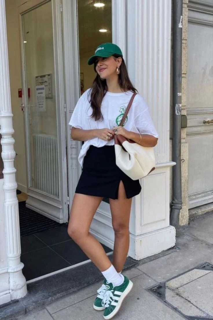 El estilo preppy se popularizó en la generación Z, y es muy fácil de adoptar con básicos de tu placard. Una remera básica, una gorra, una minifalda y unas zapatillas. ¿El tip? Sumá unos zoquetes de color blanco.