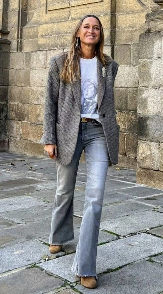 Blazer oversize, remera estampada, jean wide leg y botas texanas. El outfit ideal para ir al trabajo o para usar durante el día, creado con clásicos que la mayoría podemos tener en nuestro placard.