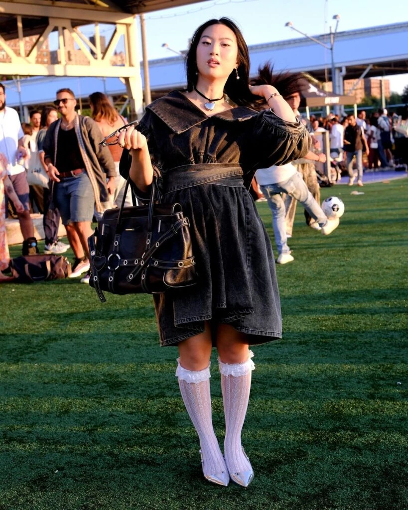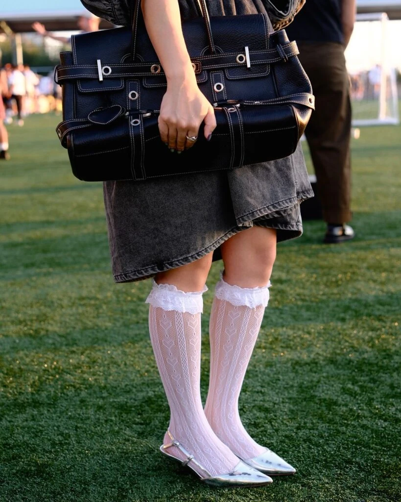 Para reforzar el romanticismo del diseño, se sumaron medias de encaje y zapatos plateados, en claro contraste con la cartea de cuero negro y con costuras.