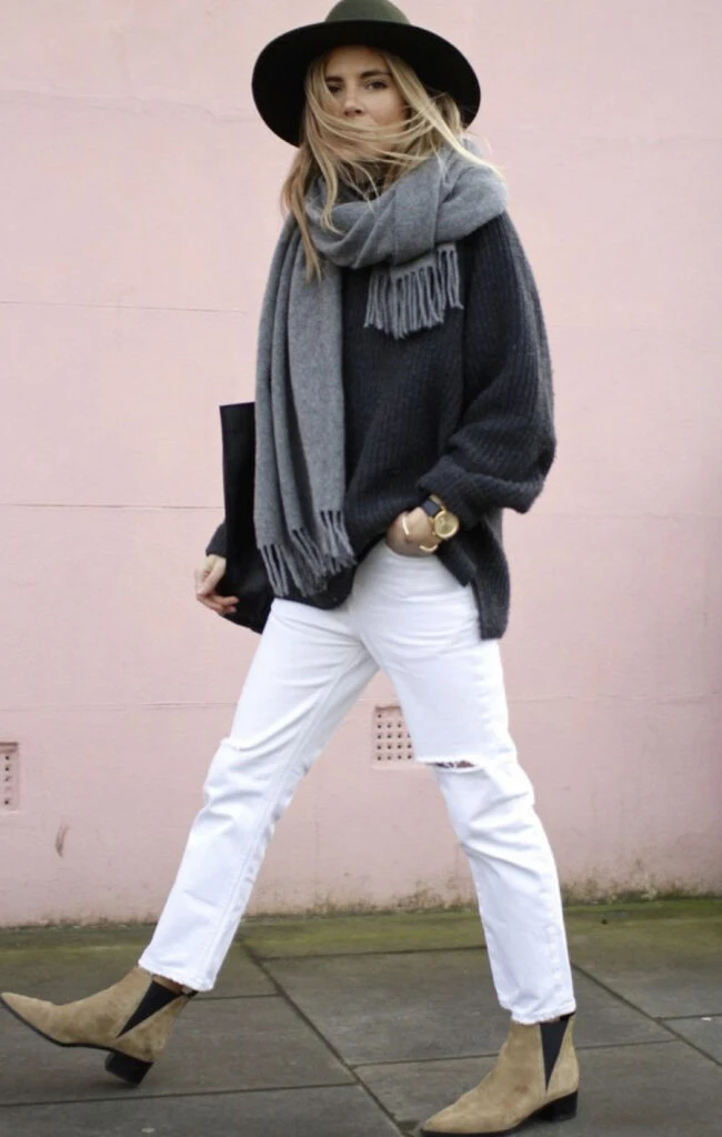El boho chic en invierno tiene un concepto diferente al de verano. Incluir un sombrero, botas de gamuza y bufandas con flecos, como vemos en la foto, es la que va. Así, vamos a lograr un outfit más relajado pero igual de trendy.