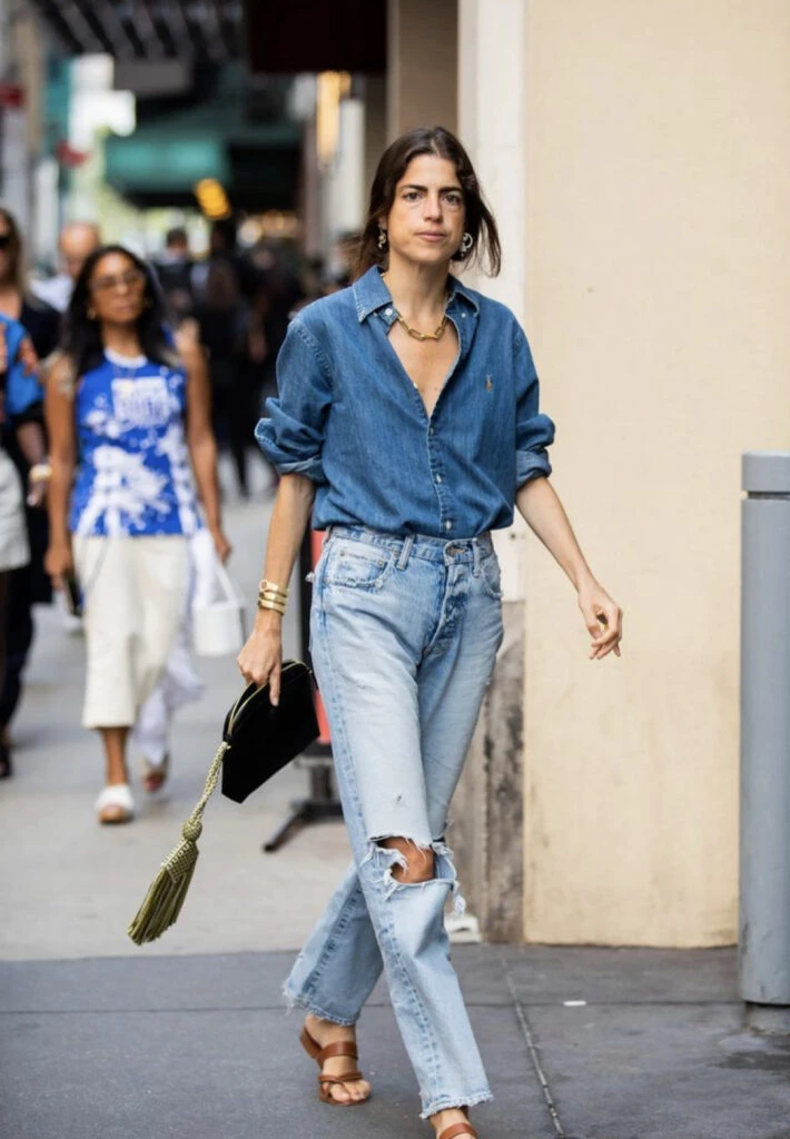 Leandra Medine, creadora de Man Repeller, usó durante el verano del hemisferio norte mucho denim sobre denim. Una tendencia que llegó de la mano del Y2K y que vamos a querer probar.