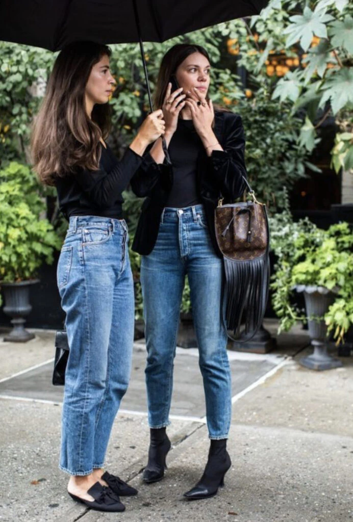 Lo mejor de estos dos looks que vemos en la foto es que están creados a partir de prendas clásicas, lo que los hace muy fácil de copiar. Eso sí, la cartera Louis Vuitton eleva el outfit y lo vuelve súper fashionista.