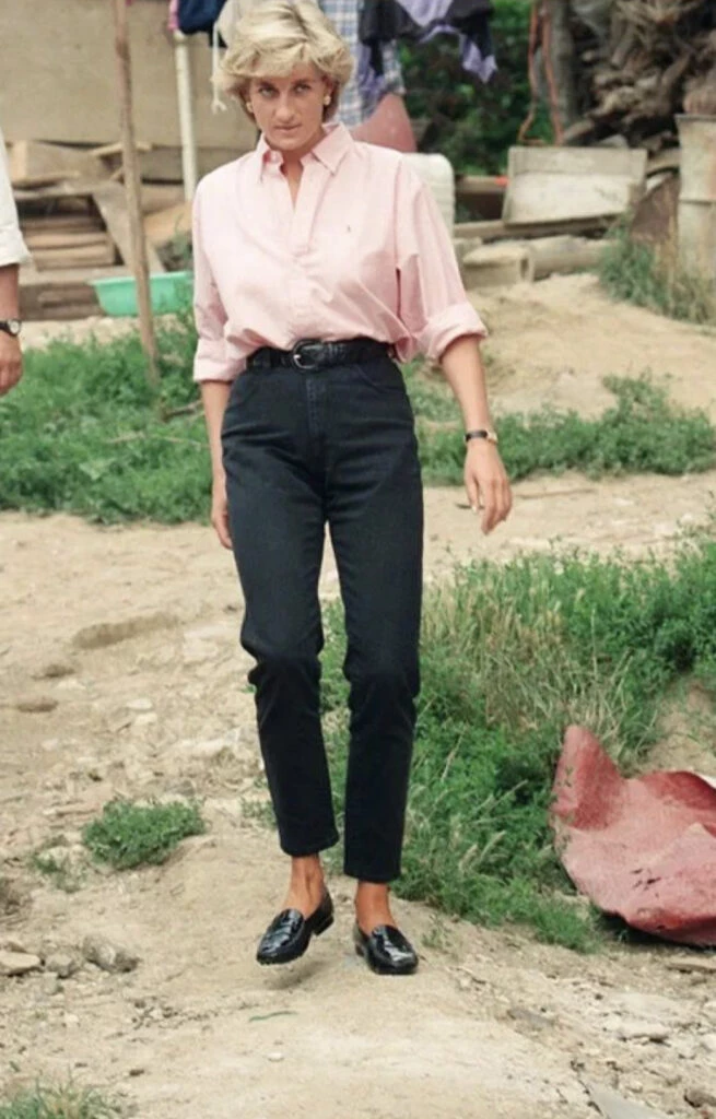 No era muy habitual verla a Diana en jeans, no es una prenda para una princesa, pero cada tanto la usaba y siempre apostaba por este modelo. Pierna recta, tiro alto, un clásico que no falla.