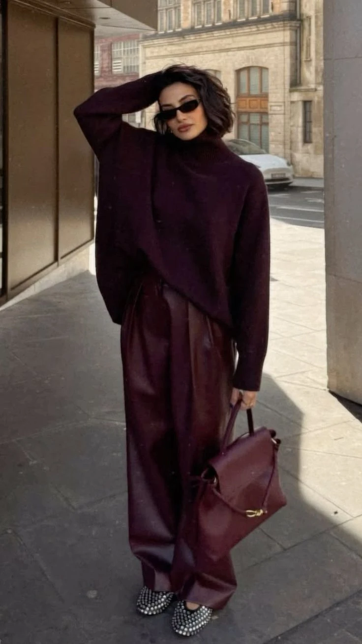- Juego de texturas: Animáte a mezclar. Un pantalón de cuero sintético berenjena con un suéter de lana gruesa en la misma gama genera ese efecto de "lujo silencioso" que tanto se usa ahora.