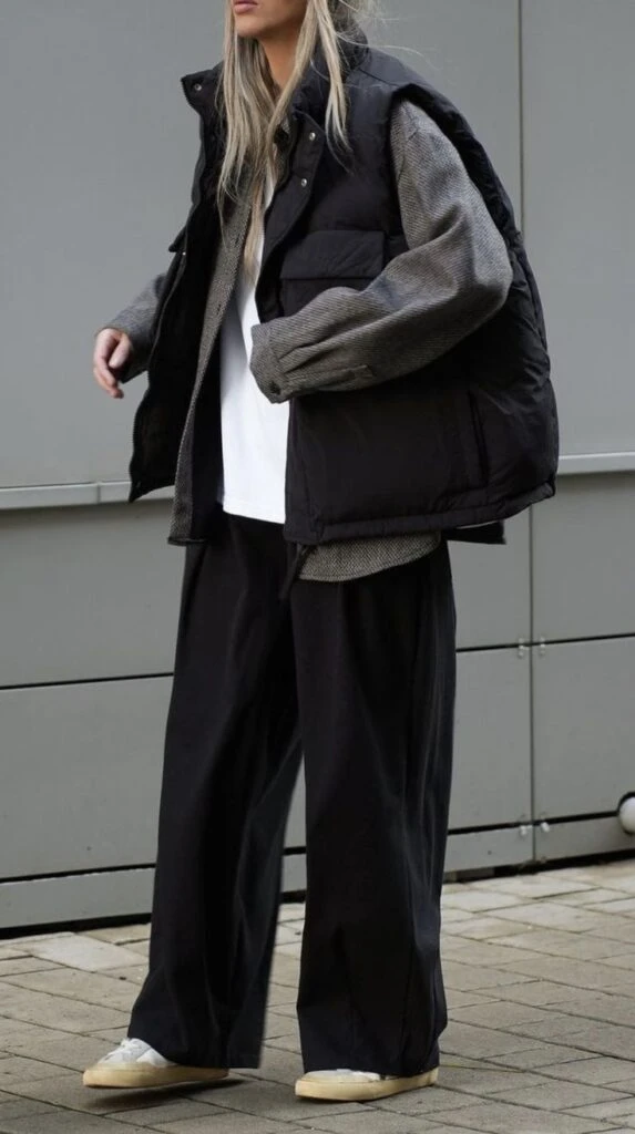 - Con pantalones wide leg o joggers urbanos: un mix infalible: chaleco inflado + pantalón ancho. Podés sumar una remera básica o buzo finito debajo y completar con zapatillas o botas cortas. Es un look comfy, descontracturado y a la vez muy actual.