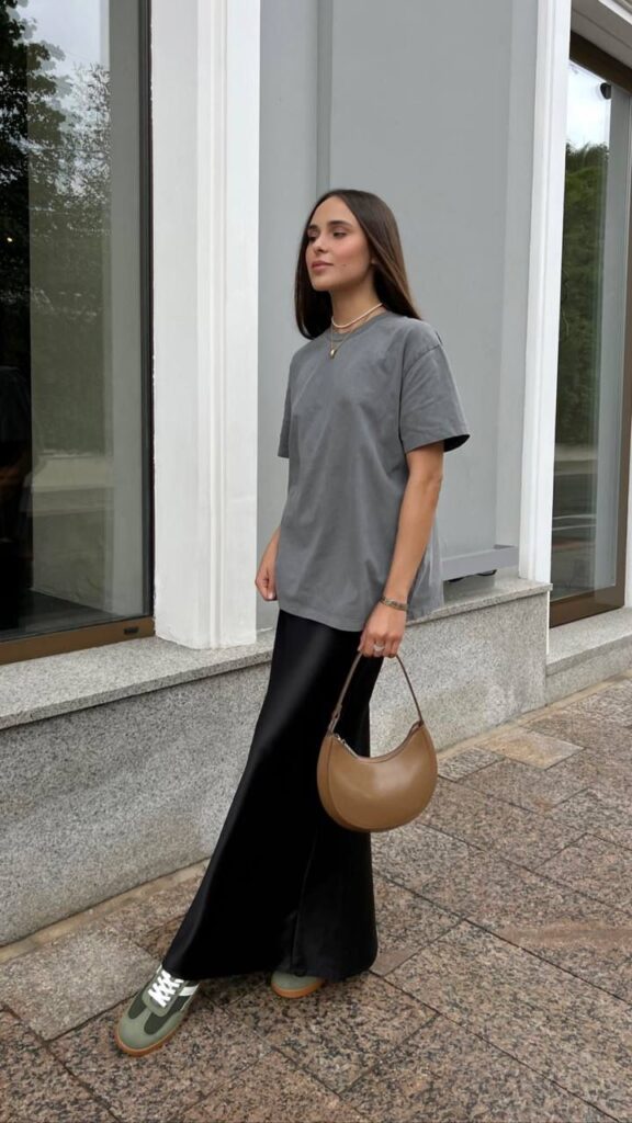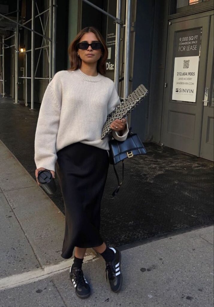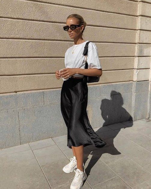 Actualmente, estamos en otoño, donde los colores tierras son los protagonistas. Sin embargo, al combinar una falda midi negra con alguna camisa marrón o canela tendrás un look súper estacional e ideal para ir a la oficina.