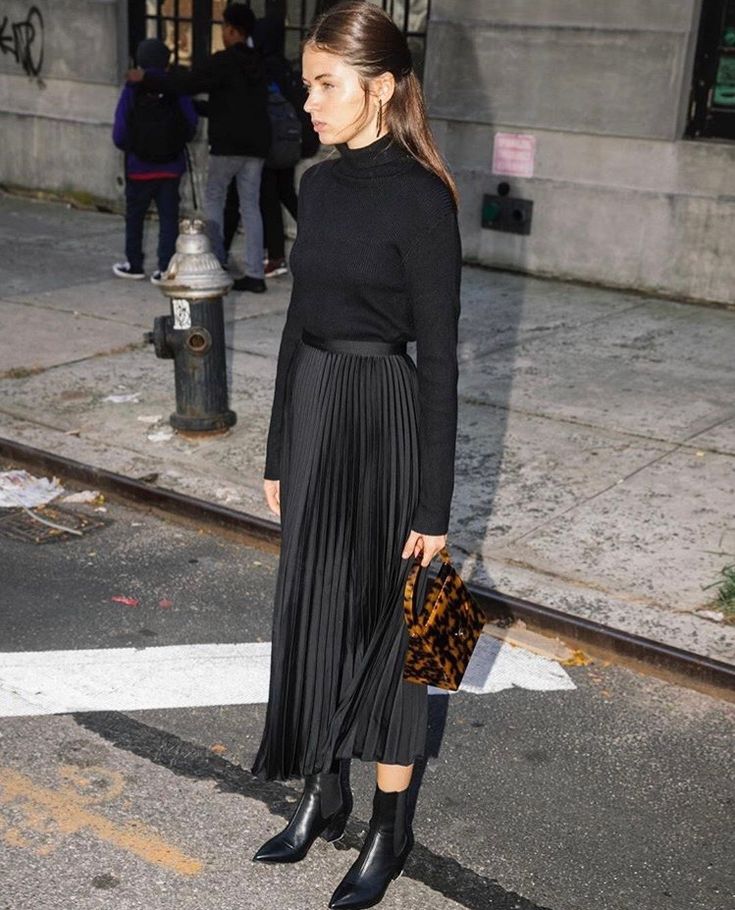 Sin embargo, este año, estas polleras se utilizan más que nada de color negro y ¿qué mejor?. Este tono se caracteriza por ser versátil, porque queda bien con cualquier estampado, porque es perfecto tanto para el día como para la noche, porque es elegante y súper chic.