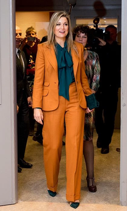 Con este total look amarillo, Máxima confirmó su amor por los colores. Llamativo y audaz, fashionista y funcional, y muy favorecedor, la reina holandesa reivindicó el traje sastre como una de sus prendas fetiche.