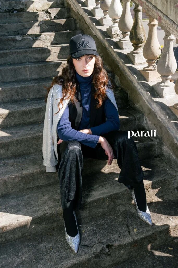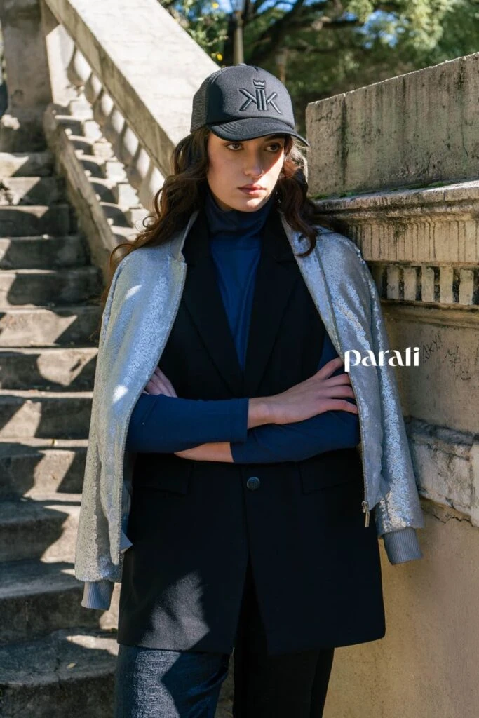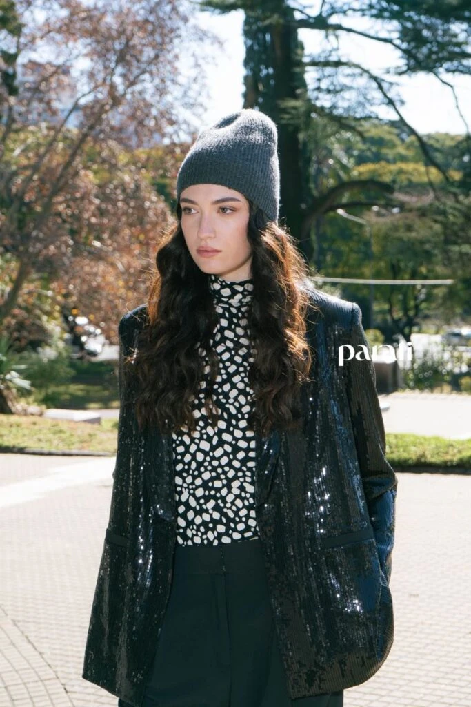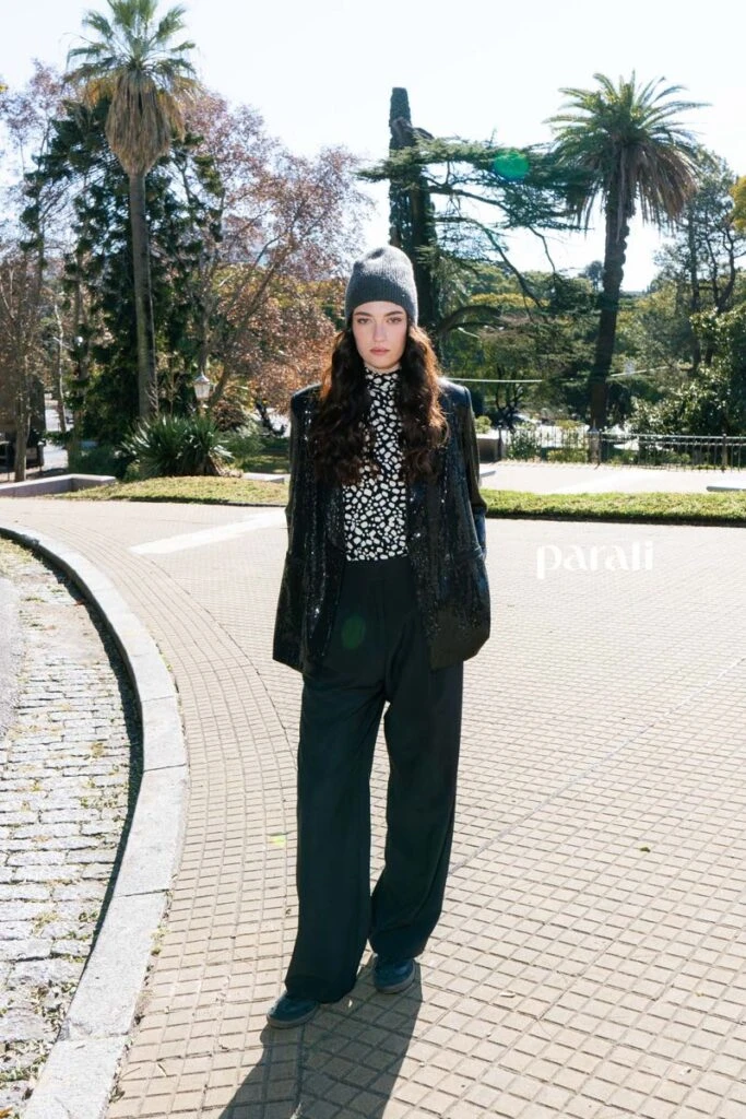 Un look para las más fashionistas. La campera bomber de paillettes cubre un chaleco de corte sastre y un pantalón ancho satinado donde las reglas tradicionales de moda se diluyen. La paleta combina azul marino + negro con el brillo plateado que se repite, incluso, en los stilettos.