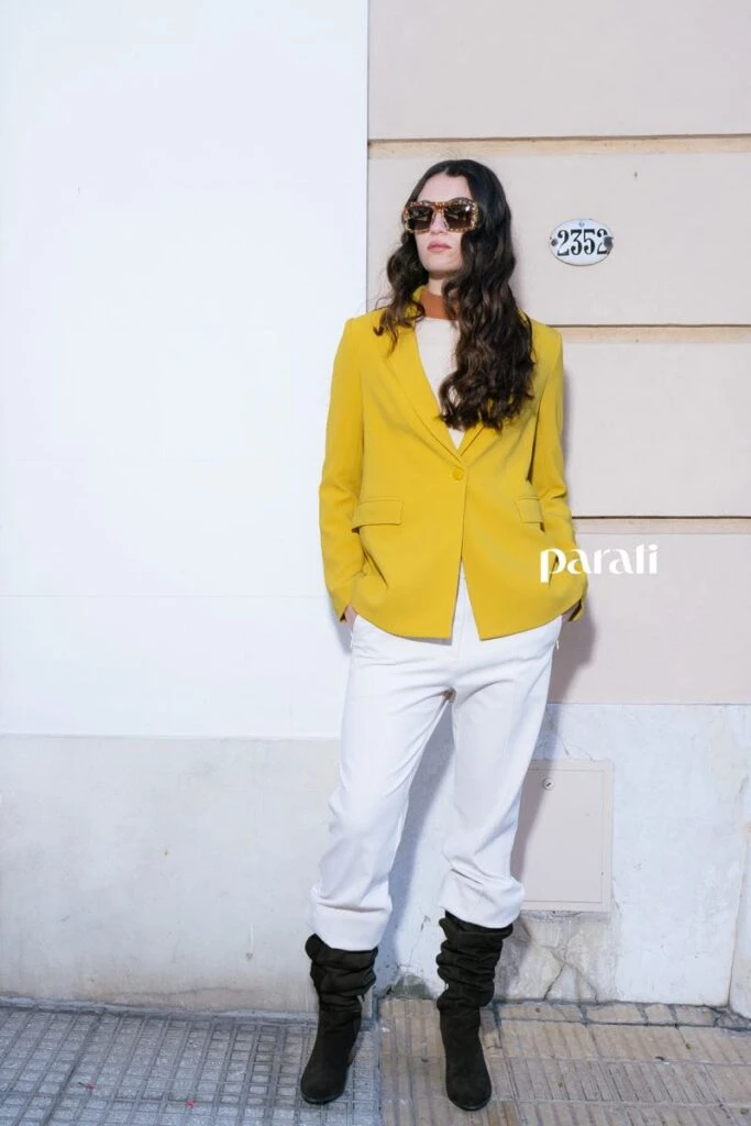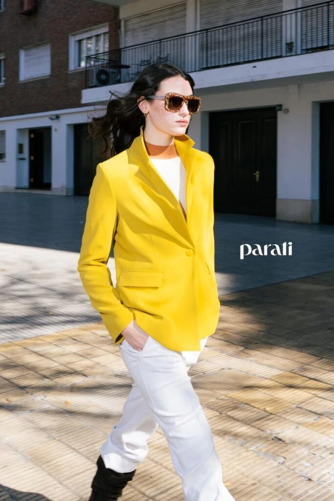 Dos colores típicos del verano se instalan e iluminan los fríos y soleados días de invierno. El blazer de corte clásico es un comodín incluso para llevar con jeans y el pantalón flare se adapta incluso para llevarlo con tacos altos o zapatillas.