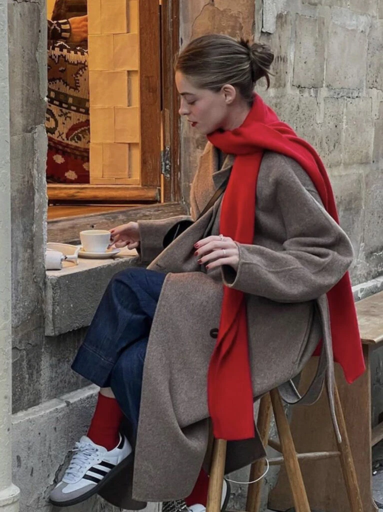 El rojo se posiciona como el color más fashionista de este otoño 2024. Puede usarse en detalles como vemos en la foto o en outfits monocromáticos. Depende de nosotras cómo vamos a usarlo.