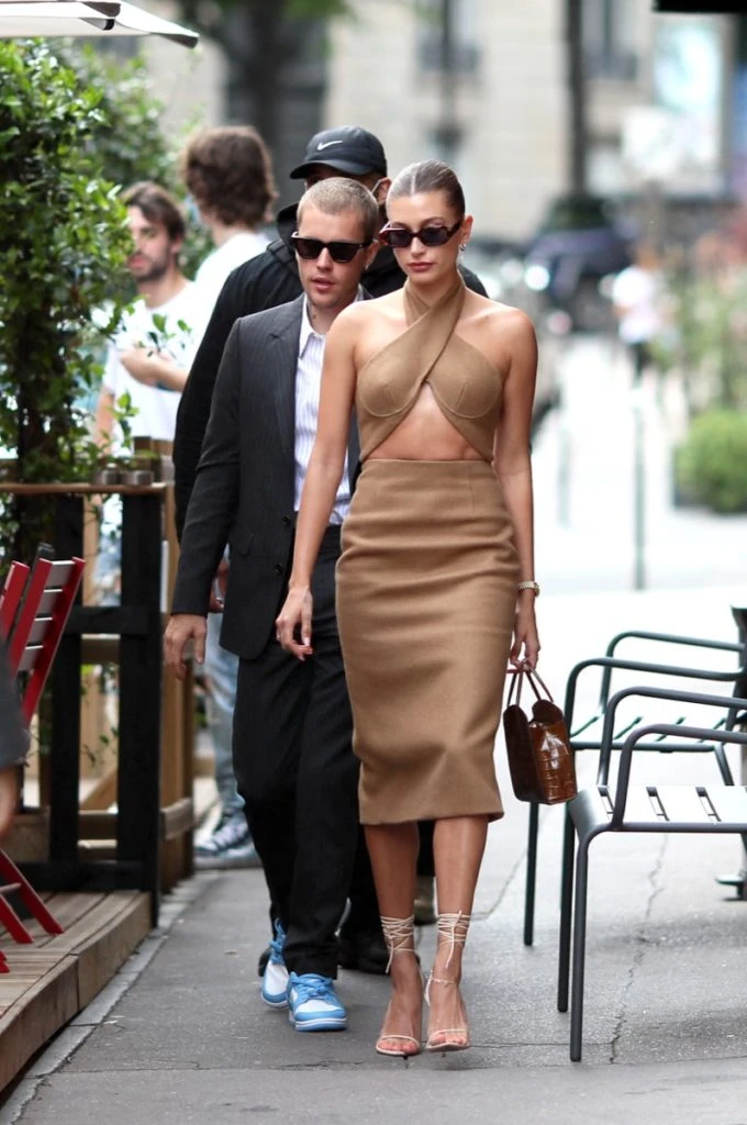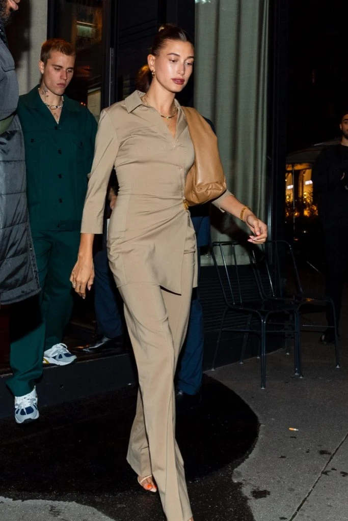 En su último viaje a París, Hailey eligió outfits en uno de los colores más chic de esta temporada, el camel.