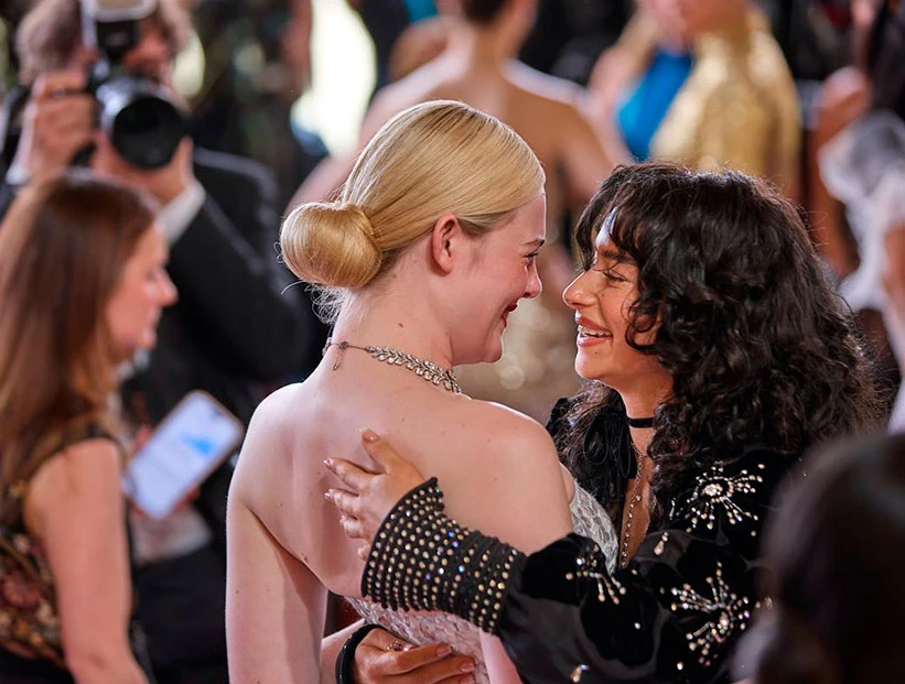 El animal print —en tonos neutros con detalles oscuros— se impone como eje del look, reafirmando su vigencia en la moda internacional. Además, el acabado con destellos aporta un aire glam ideal para la noche.