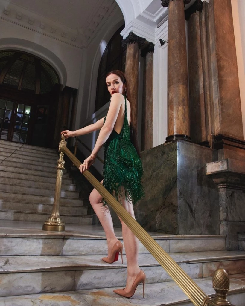 El look consistió en un mini vestido íntegramente bordado con flecos de cristal Checoslovaco en color verde oscuro, escote en V profundo, sisas cavadas y espalda súper cavada. Combinó con zapatos color nude aportando altas dosis de sofisticación.