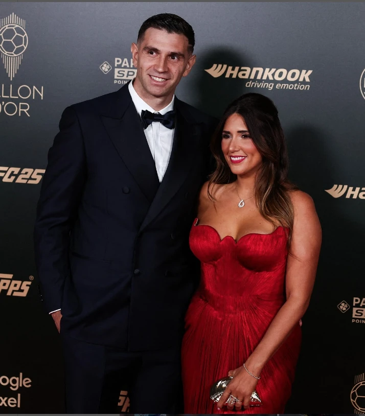 Uno de los protagonistas de la noche es el arquero estrella, Emiliano Martínez, otro de los dos argentinos nominados al Balón de Oro 2024. Mandinha, adoptó un glamoroso vestido largo en color rojo pasión, un diseño strapless con corsét y terminación de ondas. Completó su look con un pequeño clutch rígido de metal plateado.
