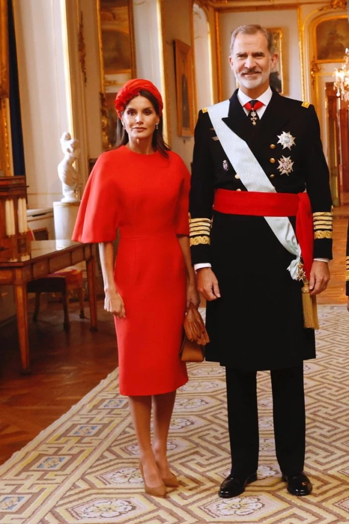 Letizia eligió vestirse de unas de sus firmas favoritas, Carolina Herrera. Como abrigo llevó una capa en color camel con cuello de piel y lo combinó con un vestido de color rojo con falda lápiz, largo midi y mangas acampanadas al codo.