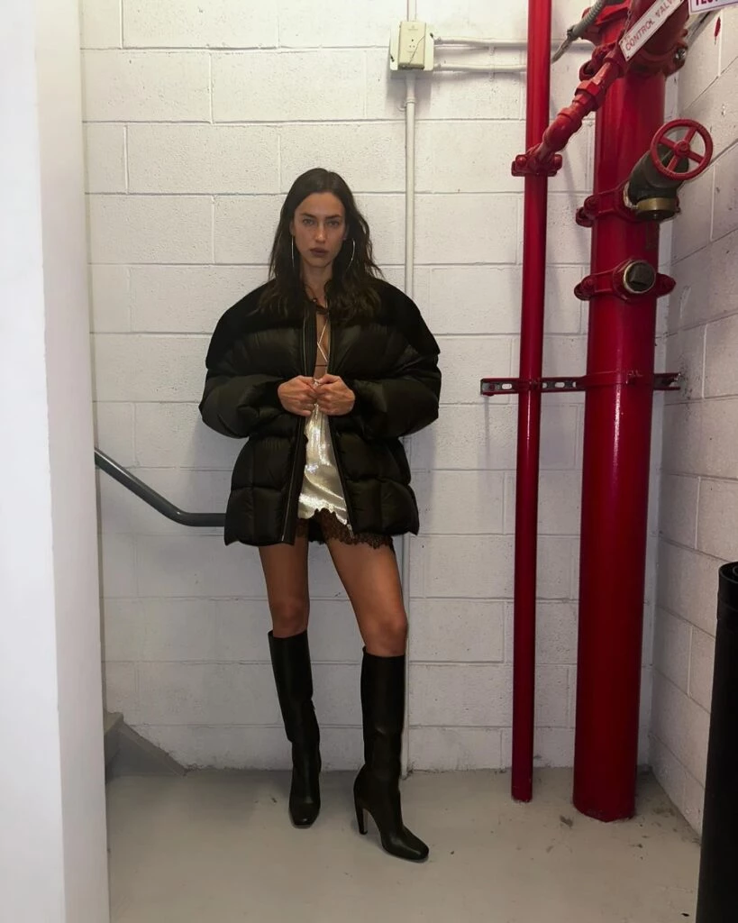 Irina eligió un vestido color champagne, con tirantes y encaje en los costados, una prenda que parece un babydoll, pero que la Generación Z impuso en la moda debido a su capacidad de adaptarse en cualquier situación. Además, lo combinó con unas botas negras altas y una puffer del mismo tono.