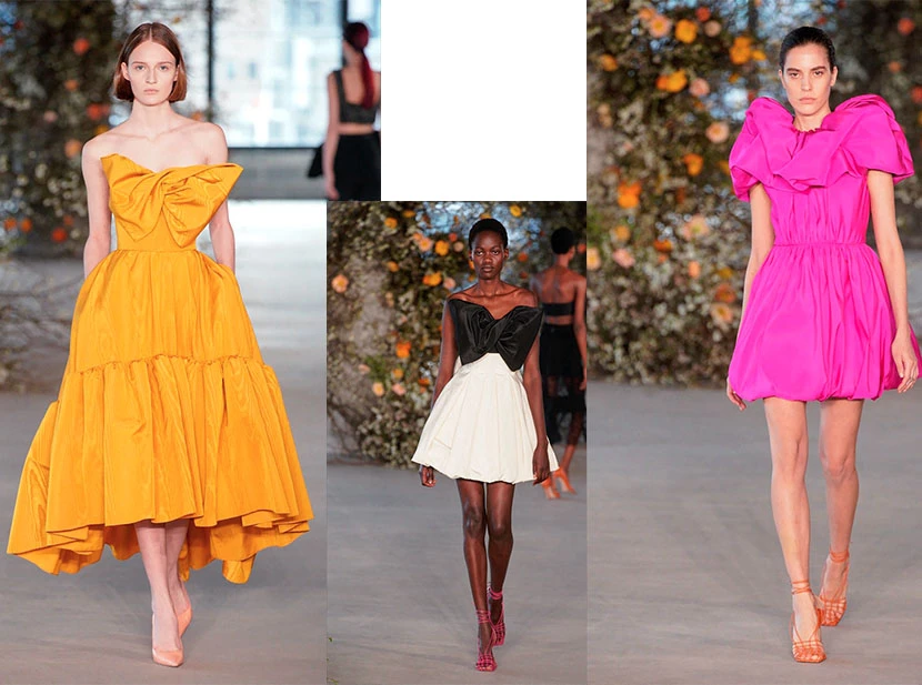 Se destacaron las siluetas con grandes volúmenes conseguidos con el tul, escotes de palabra de honor y decorados con grandes lazos.