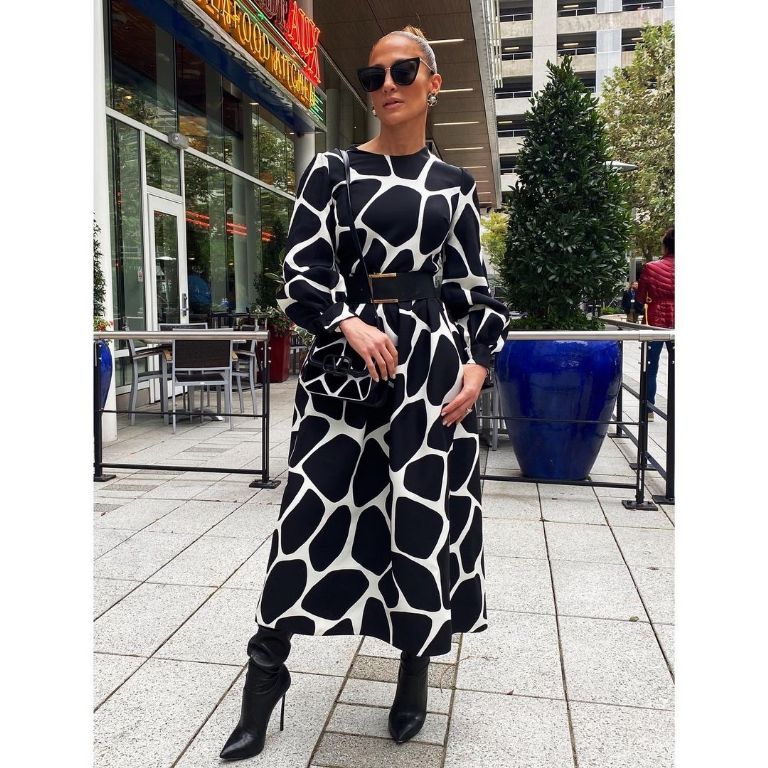 Jennifer Lopez luce un vestido de Valentino, inspirado en un estampado tipo cebra, en blanco y negro, que se permite jugar un poco más con la fantasía, sin representar a ningún animal en concreto. El blanco y negro siempre es elegante y esta propuesta lo es aún más. Lo acompañó con un cinturón ancho y una cartera de la misma firma, con idéntica estampa. El peinado y unos buenos accesorios como aros en este caso, son importantes para complementar.