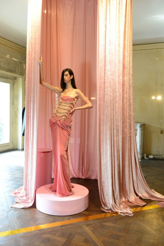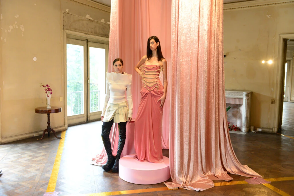 -En París. Cuando estaba estudiando un día vino a dar una charla Didier Grumbach, uno de los grandes historiadores de la moda, y recuerdo dijo que es muy importante que todos los diseñadores que no son franceses y que vienen a hacer moda a París traigan lo propio. Eso en ese momento me generó una contradicción porque dije ¿qué voy a decir de la Argentina que no sea un cliché?, ¿voy a hablar del gaucho y voy a poner una rubia arriba de un caballo? ¿cómo se toma este acervo que sin duda es bello sin caer en la caricatura? Ahí empezó todo este proceso desde la estética, de cómo construirlo y llevarlo a esta óptica súper y ultra femenina o de lo ultra queer, lo estridente. Es decir, sacarlo de los colores de la naturaleza del campo para que entre toda esta óptica del strass, del rosa, de lo ultra artificial, lo muy kitsch. Ahí comenzó la historia.