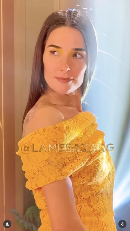 El conjunto estuvo compuesto por un pantalón palazzo amplio y un top de encaje con cuello volcado drapeado, sostenido por un lazo de gasa. El detalle más comentado fue el color: un amarillo intenso que Juana bautizó “papaya”, aunque ella misma reconoció entre risas que el tono fue motivo de debate en la producción.