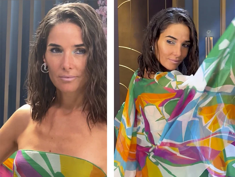 "El pantalón es de cintura alta y gasa color verde", explicó. Y agregó, en referencia a su look total: "Y todo con un caftán de gasa multicolor". La actriz llevó un peinado suelto con efecto wet y make up al tono de su conjunto.