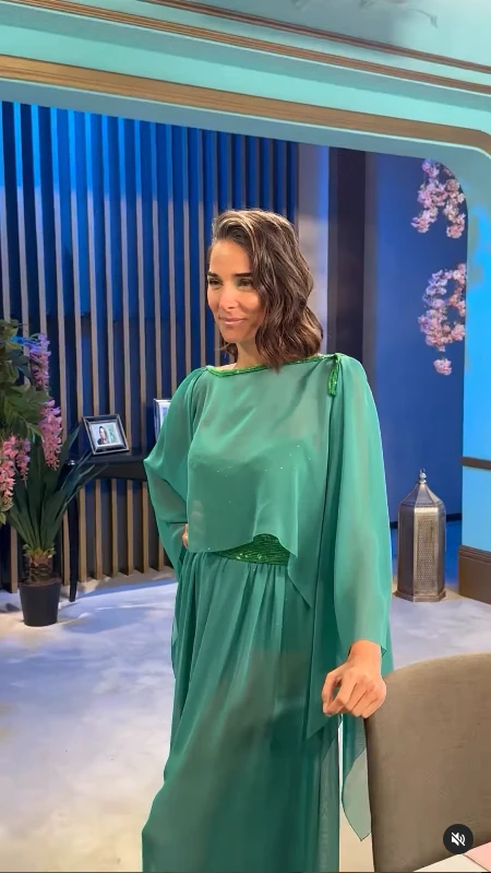 "Es un conjunto de gasa color verde celadon oscuro de amplio pantalón con cintura alta, sobre top escotado con una túnica corta e irregular", agregó la actriz que invitó a sus seguidores a ver la obra "Juana" que presenta en el teatro Regio.