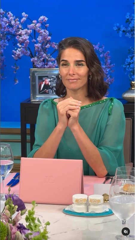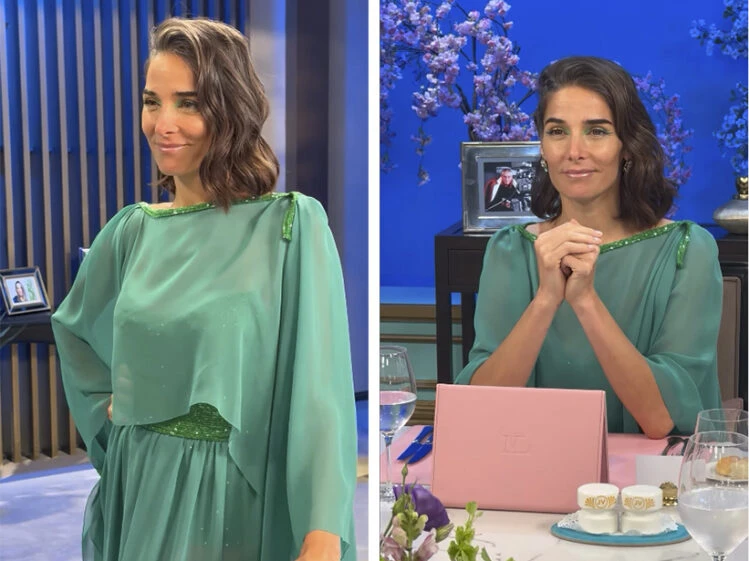 Juana Viale sorprendió este domingo en la mesaza con un look de gasa en color "verde celadón", según explicó ella misma. Como de costumbre, la nieta de Mirtha Legrand llevó un estilismo creado por Gino Bogani, su modisto de cabecera.