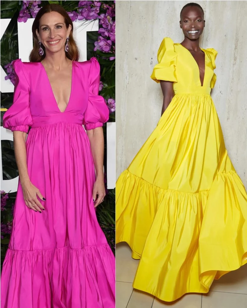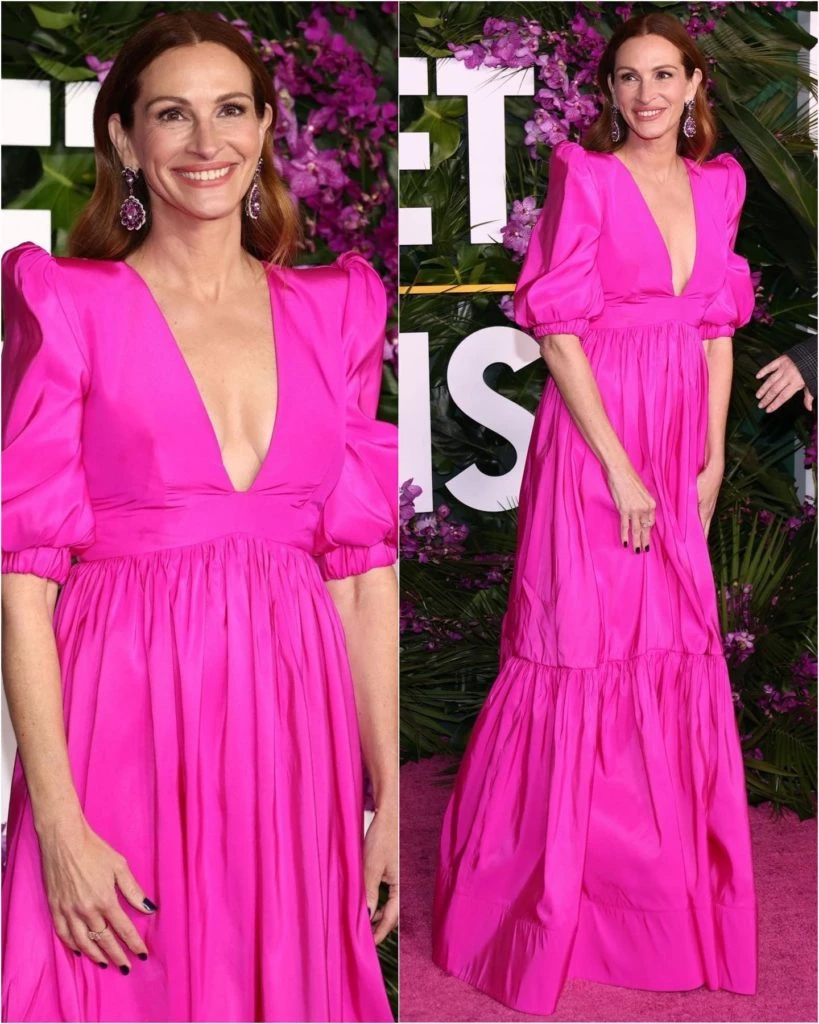 Para la avant premier de Ticket to paradise, la actriz eligió uno de los diseños estrella de la última colección de Valentino: un maxivestido con el color del momento con escote en V pronunciado, mangas tres cuartos con volumen y falda amplia con volados, un mix entre lo elegante y lo descontracturado.