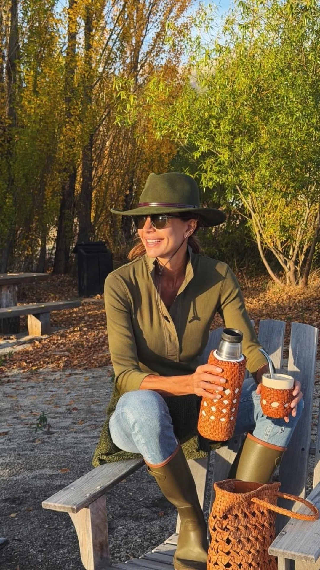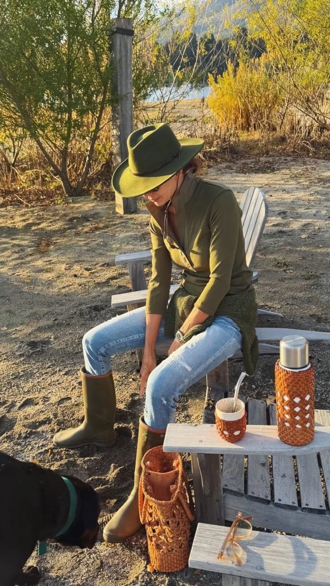 Hay algo en el conjunto que habla de comodidad real. Las botas de goma, el sombrero en el mismo tono verde, los accesorios en materiales naturales: todo construye una estética coherente.