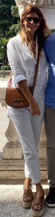 Completó el look con cartera tipo bandelera y sandalias con tiras cruzadas y plataformas forradas en hilo sisal.