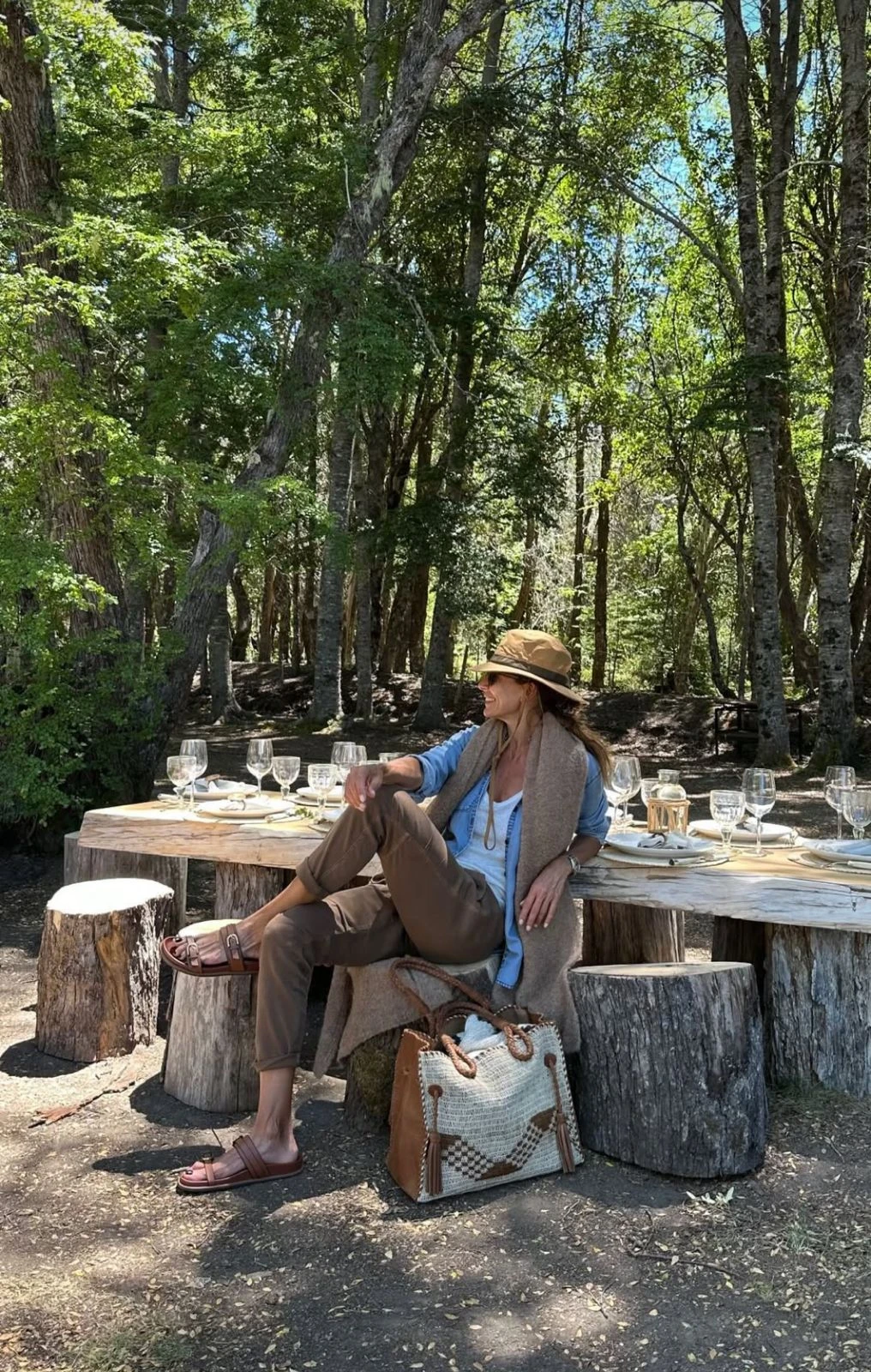 Para esta jornada especial, la empresaria textil lució un look estilo outdoor compuesto una musculosa blanca de algodón devoreé, camisa de jean abierta y pantalón marrón haciendo juego con una bufanda de cachemire. Además, usó unas sandalias, sombrero y gafas de sol.